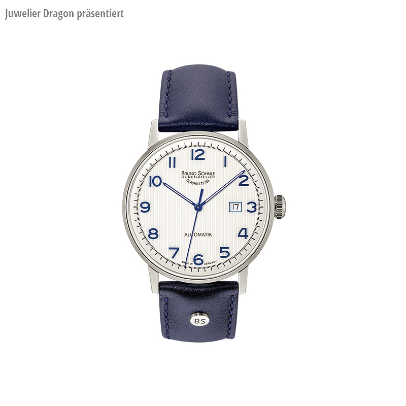 Automatikwerk BS175 (Basiswerk Sellita SW200), Gehäuse Edelstahl Ø 42,0 mm, Höhe 10,8 mm, 5 ATM Wasserdicht, Saphirglas innen entspiegelt, Kalbslederband blau, Dornschließe
