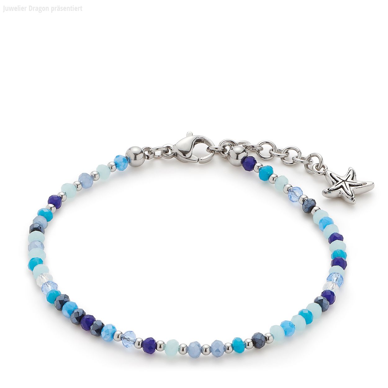 Die Sehnsucht nach Urlaub am Meer lässt sich mit dem zarten Armband aus gelüsterten Schliffglasperlen stillen. Dabei werden die verschiedenen Blautöne von silberfarbenen Edelstahlkügelchen sowie einem winzigen Seestern-Anhänger aus Edelstahl symbolhaft auf den Punkt gebracht.