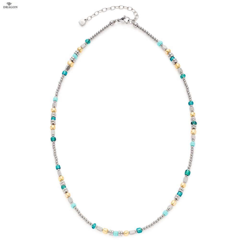 Diese kurze Halskette setzt sich aus verschiedenen Edelstahl- und Rocailles-Glasperlen in Türkis, Petrol, Emerald und goldenem Ton zusammen. Das erfrischend bunte Farbenspiel macht Lust auf einen Tag am Meer.
