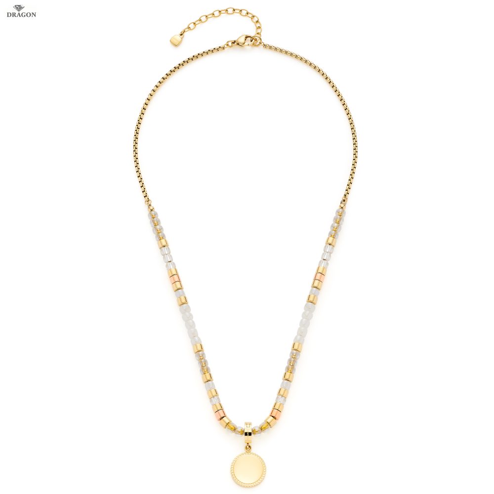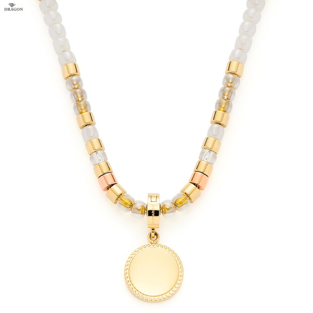 Goldene Sommersonne, warmer Sand, unbeschwerte Stunden am Meer. Mit diesem Schmuckstück, bestehend aus aneinandergereihten Glas- und Edelstahlperlen in goldenem und roségoldenem Farbton, trägt frau die Sonne um den Hals. Im Nacken sind die Perlen von einer weich fließenden Venezianerkette gehalten. Zusätzlich ist der Schmuck mit einem am Rand fein ziselierten und gravierbaren Münz-Anhänger aus der Clip&Mix-Serie versehen.