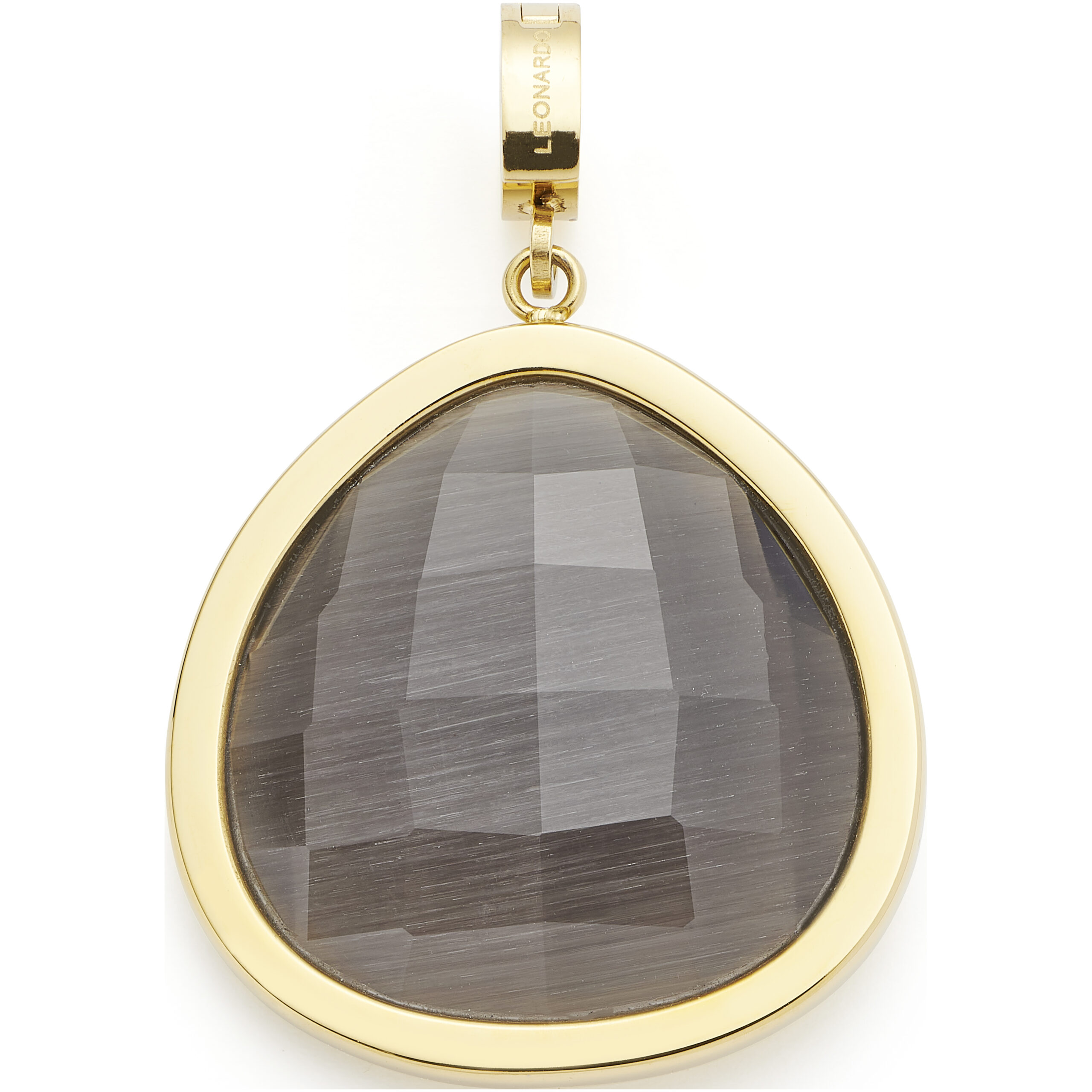 Der Anhänger MINA beeindruckt mit seinem modernen, geometrischen Design. Der gewölbte Catseye-Stein in elegantem Grau erhält durch den Schachbrettschliff eine besondere Tiefe und wird von einem klaren Goldrahmen eingefasst. Die abgerundete Dreiecksform macht MINA zu einem stilvollen Blickfang, der sich mit Clip Größe M mühelos in Deine Schmuckkombination integrieren lässt