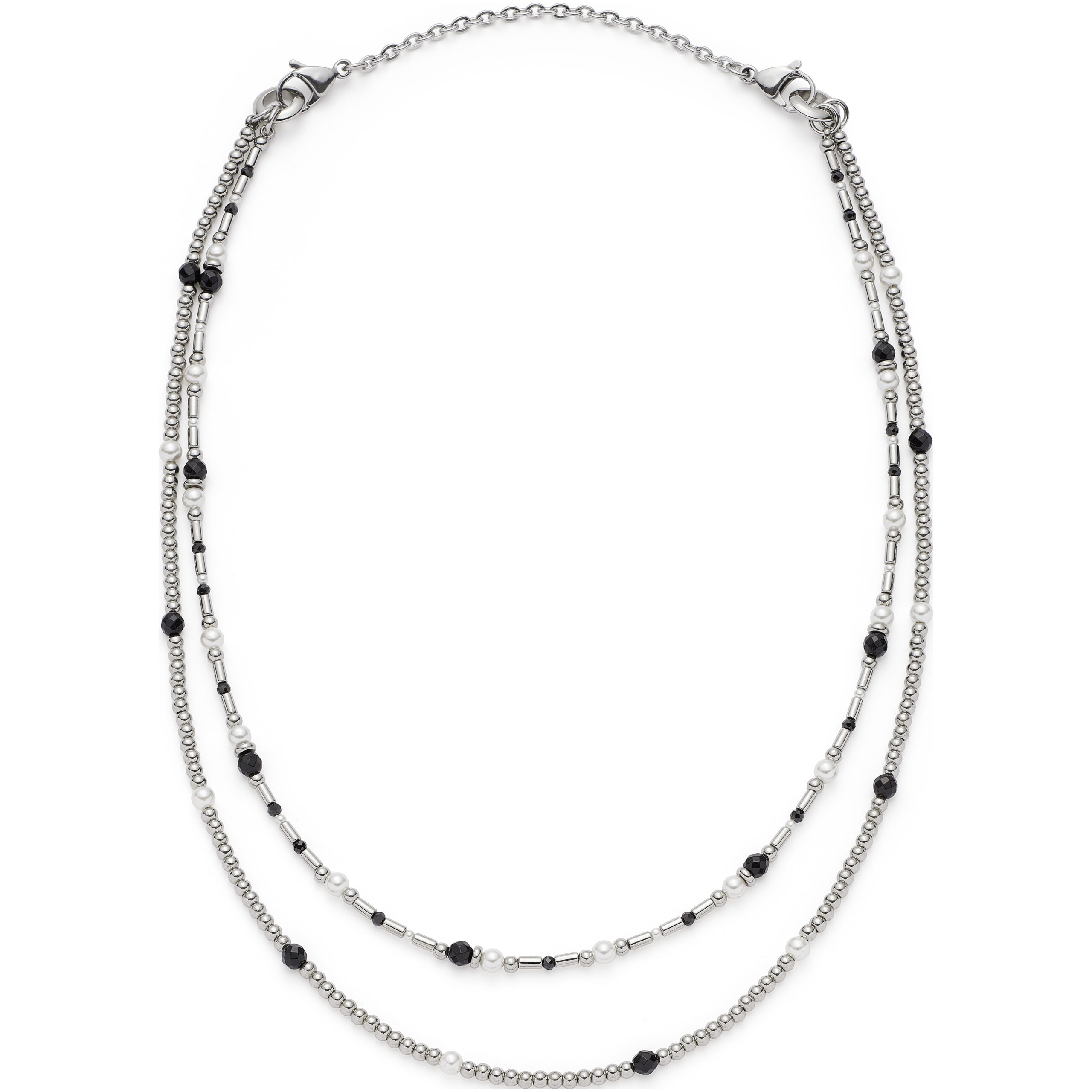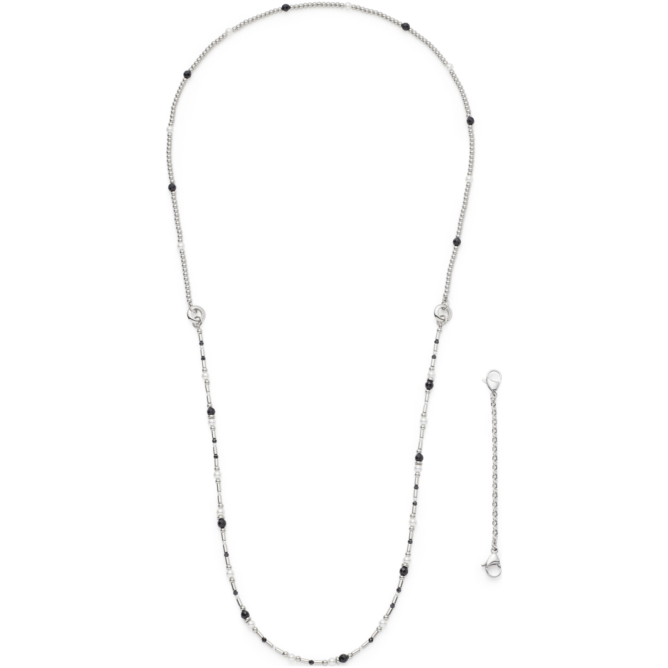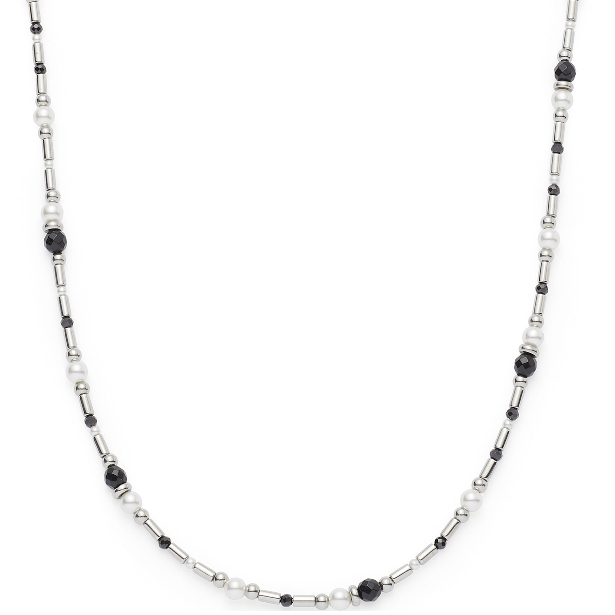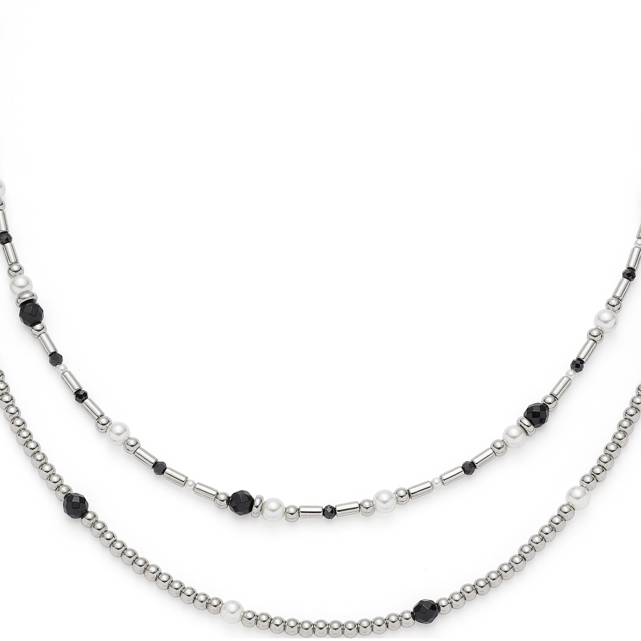 Die Halskette SABINE ist ein stilvolles Statement im klassischen Black & White Look. Silberfarbene, polierte Kugeln treffen auf facettierte, schwarze Glasperlen und natürlich wirkende, weiße Perlen. Die zwei Segmente der langen Vario-Kette sind durch markante MetallRinge verbunden, die nicht nur dekorativ sind, sondern auch Platz für Clip & Mix Anhänger bieten. Dank der flexiblen Trageoptionen kannst Du die Kette lang, doppelreihig oder individuell mit Anhängern gestalten ? perfekt für vielseitige Looks von elegant bis modern.