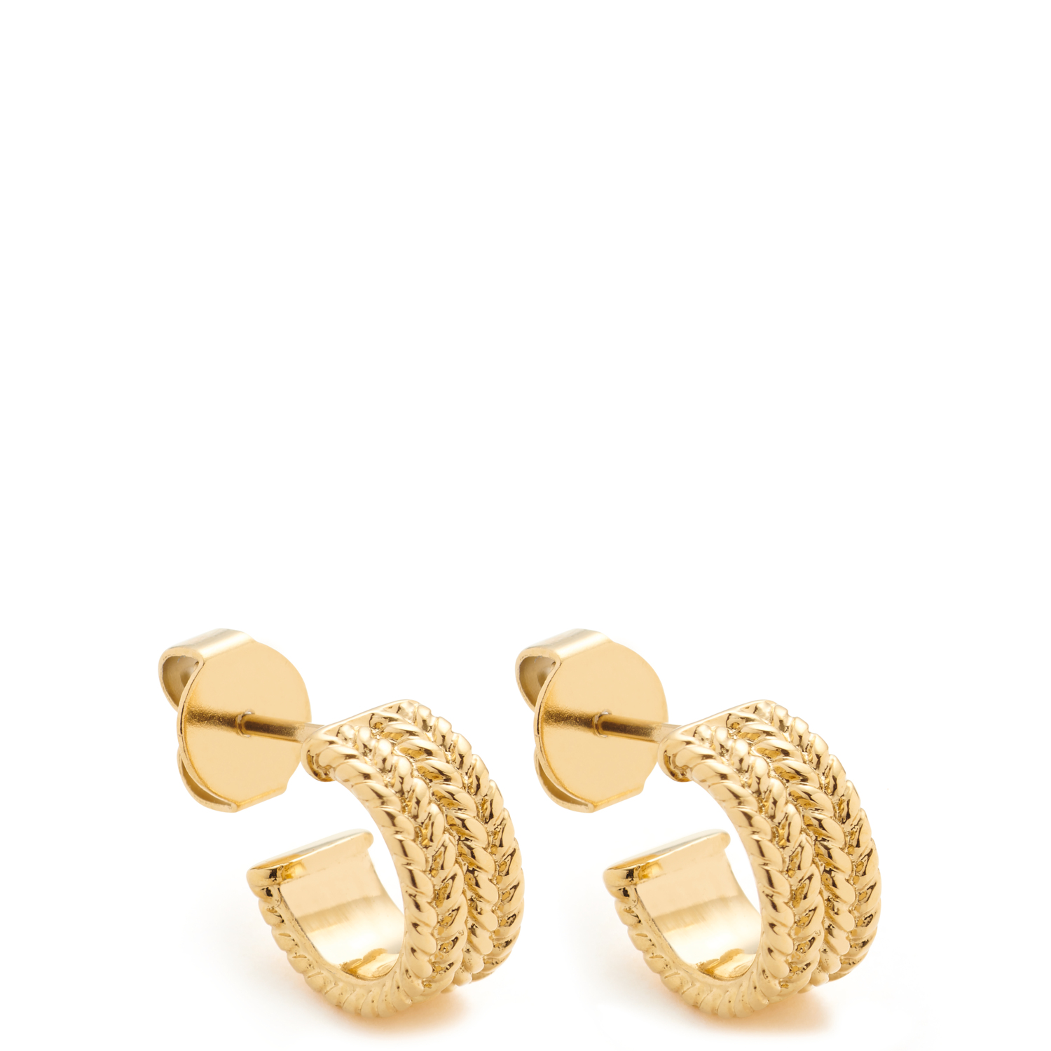 Zeitlose Stilklassiker präsentieren sich hier in Form kleiner Band-Steckkreolen mit fein ziselierter Zopfstruktur. Sie wirken durch den golden ionenplattierten Edelstahl besonders elegant und unterstreichen schicke Looks mit einer großen Portion Stilexpertise. Außerdem sind sie die perfekte Ergänzung für Halskette und Ring aus der Serie Theresia.