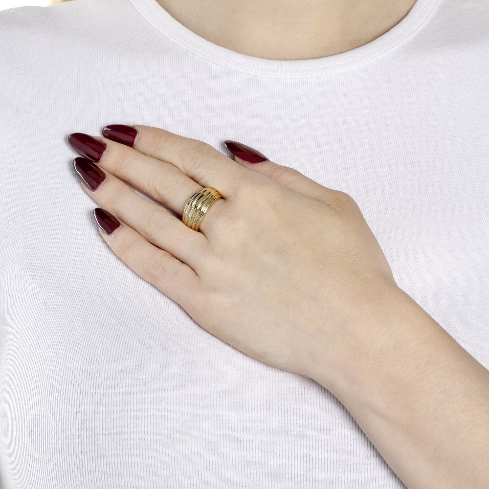 Verleihe deinem Look einen modernen Eyecatcher mit diesem vergoldeten Ring. Sein breites Design besteht aus umlaufenden Runddrähten, die zu den Handinnenflächen schmal zulaufen. Mit seiner grafisch angehauchten und opulenten Optik verkörpert er den cleanen Statement-Style. Kombiniere ihn mit natürlichen Styles für monochromen Minimalismus oder baue deinen nächsten Glamour-Look auf ihm auf.