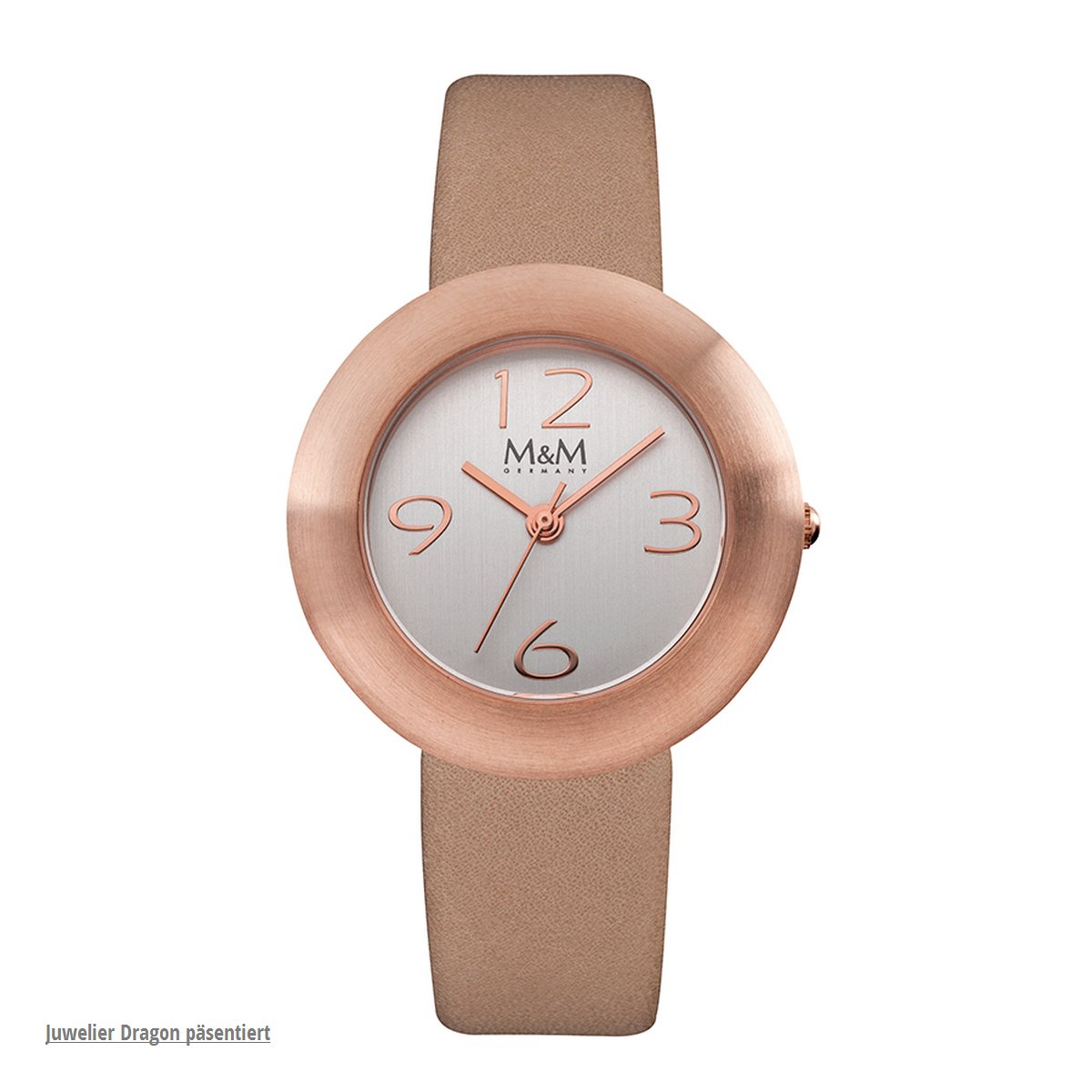 Die Armbanduhr der Marke M&M aus Deutschland hat ein stabiles Gehäuse aus Edelstahl, IP rose, matt. Geschützt von äusseren Einflüssen bis zu einem Wasserdruck von 3 ATM zeigt präzise ein Quarzwerk die Uhrzeit. Das Gehäuse hat einen Durchmesser von 32 Millimeter.