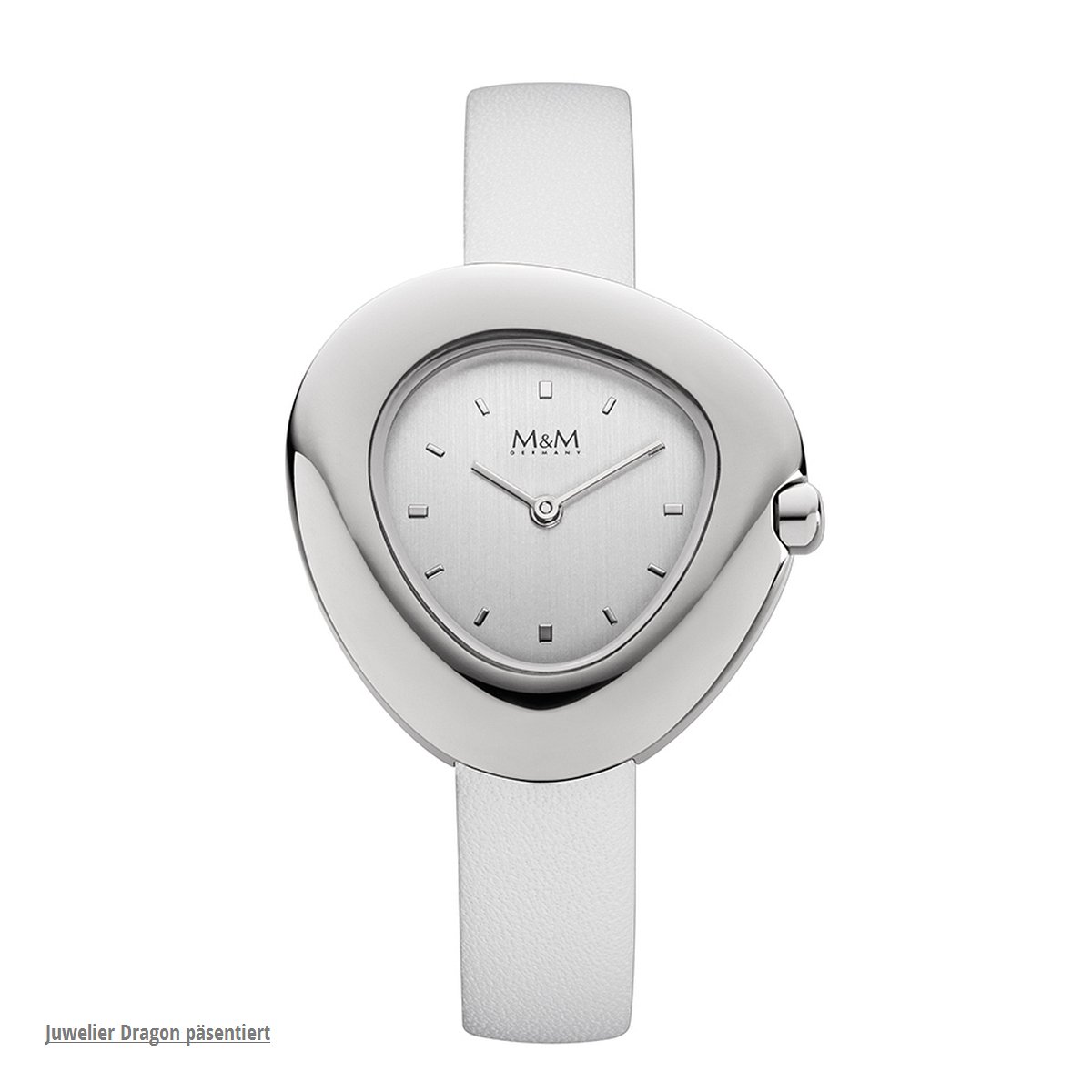 Die Armbanduhr der Marke M&M aus Deutschland hat ein stabiles Gehäuse aus Edelstahl, poliert. Geschützt von äusseren Einflüssen bis zu einem Wasserdruck von 3 ATM zeigt präzise ein Quarzwerk die Uhrzeit. Das Gehäuse hat einen Durchmesser von 36×38 Millimeter.