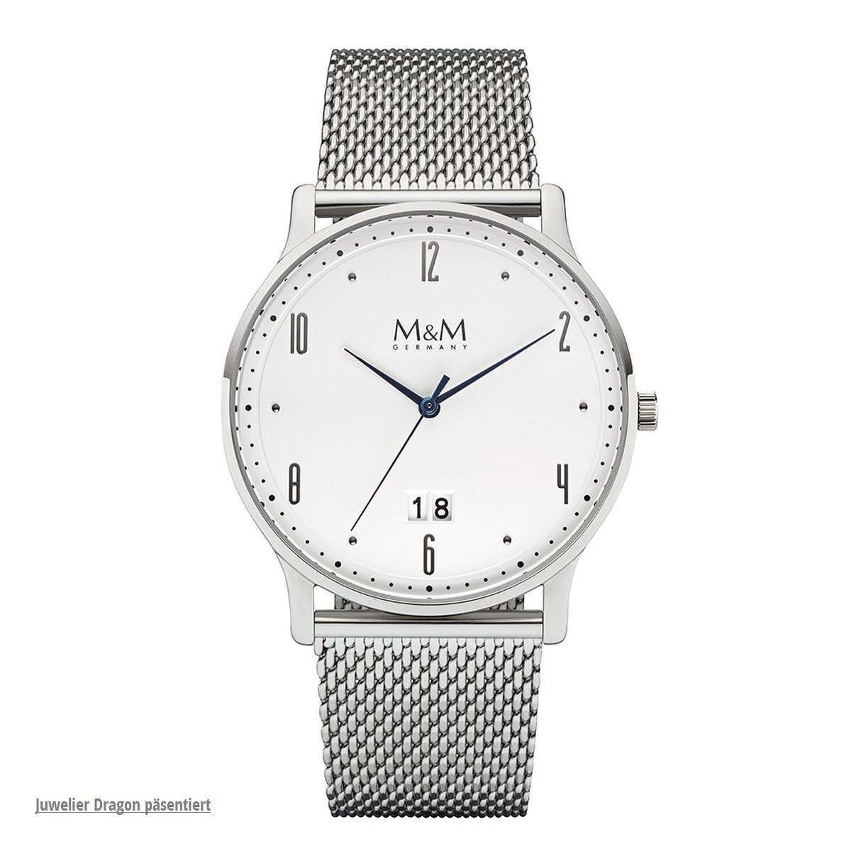 Die Armbanduhr der Marke M&M aus Deutschland hat ein stabiles Gehäuse aus Edelstahl, poliert. Geschützt von äusseren Einflüssen bis zu einem Wasserdruck von 3 ATM zeigt präzise ein Quarz, Datumwerk die Uhrzeit. Das Gehäuse hat einen Durchmesser von 40 Millimeter.