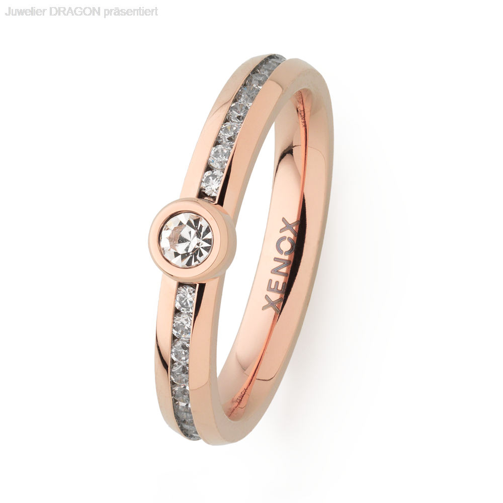 Eine Ode an die Liebe. Das ist unser Statement-Ring aus glänzendem, rosé beschichtetem Edelstahl. Er präsentiert sich stolz mit einer Reihe Zirkonia-Steine, die zu einem größeren Stein als Hingucker führen. Perfekt für jeden romantischen Anlass.