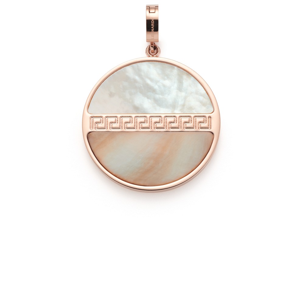 Natürliche Materialien wie schimmerndes Perlmutt, Beige-Töne und ein ornamental gemusterter Edelstahl-Steg, der den weißen vom beigefarbenen Perlmutt-Part trennt, erheben diesen Anhänger zu einem kleinen Kunstwerk. Aufgrund dieser Natürlichkeit ist jeder Anhänger ein Unikat. Die cleane Rückseite bietet sich für individuelle Gravuren an.