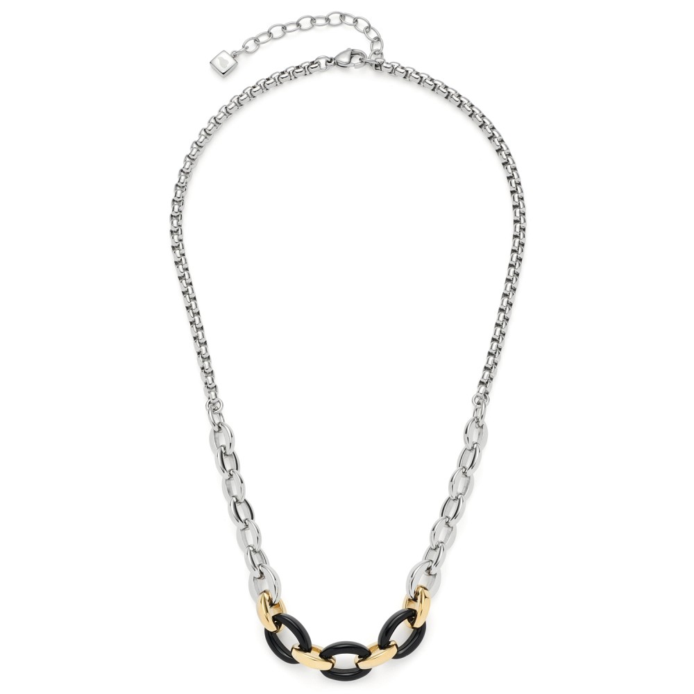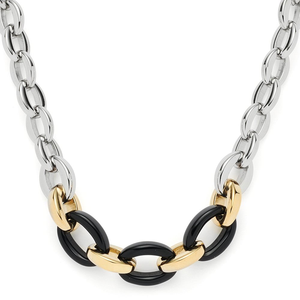 Immer größer werdende Chunky Chains prägen das Bild dieser kurzen Halskette aus ovalen Kettengliedern und einer kräftigen Venezianer-Kette mit Karabinerverschluss und Verlängerung. Der Metall-Mix wird stilvoll und im Zentrum des Colliers um drei schwarze Onyx- und golden ionenplattierte Kettenglieder ergänzt.