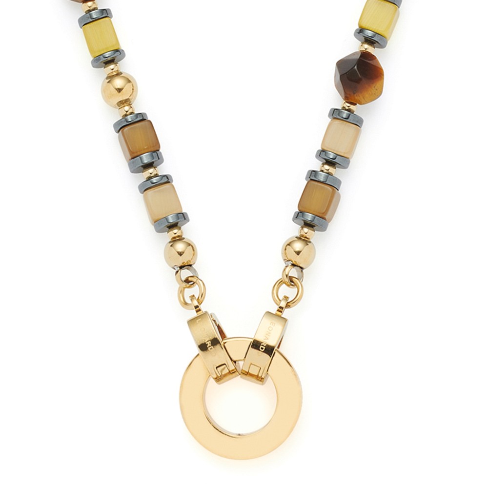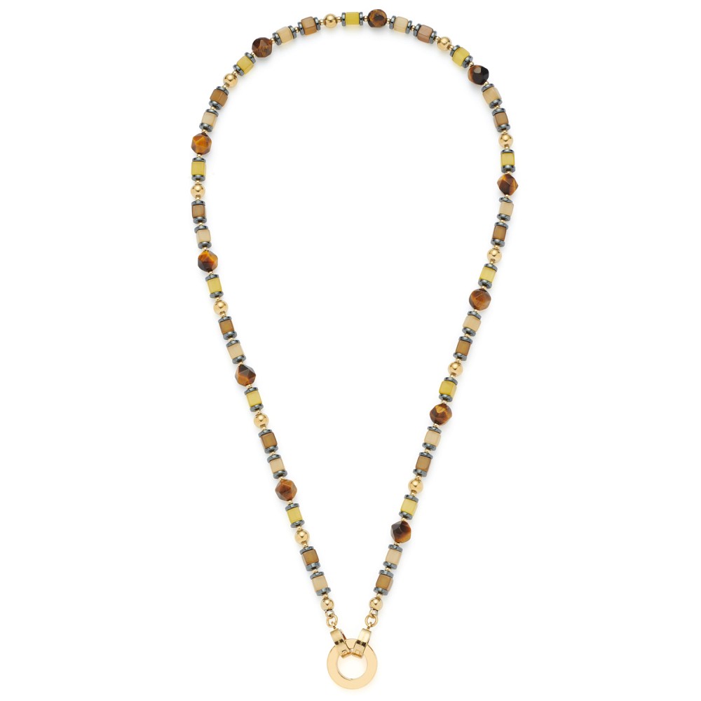 Naturtöne wie Braun und Beige machen das kurze, halsnahe Collier zum modischen Erlebnis. Aufgereihte Tigeraugen-Perlen, Catseye-Perlen in Würfelform und anthrazitfarbene Hämatitscheiben-Perlen wechseln sich mit golden ionenplattierten Edelstahl-Perlen ab. Die Kombination mit einer Gliederkette steht dem Collier sehr gut zu Gesicht und erzeugt einen gefragten Look.