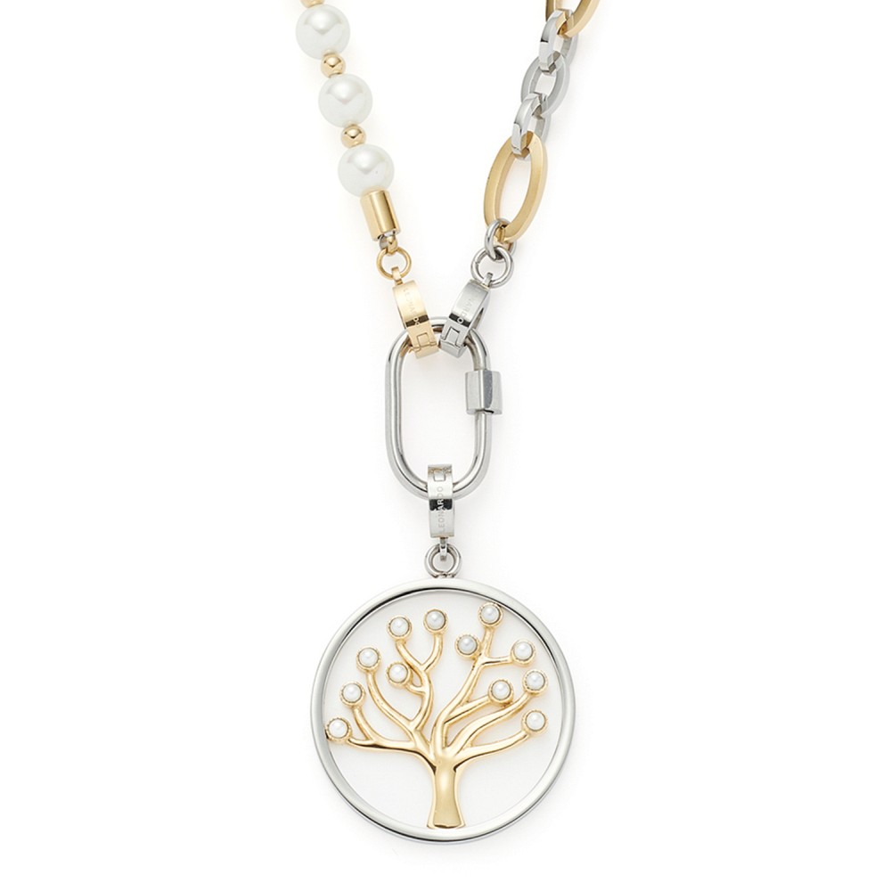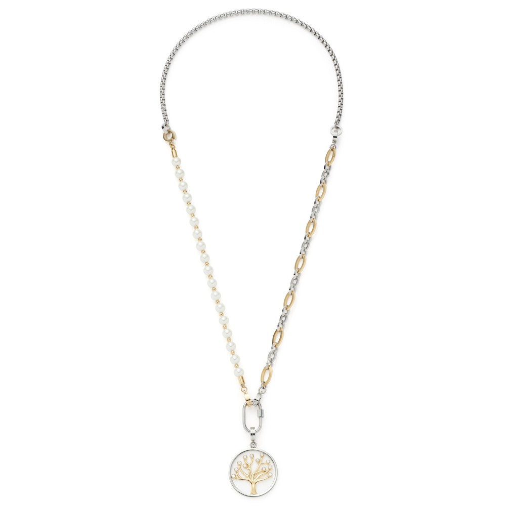 Die nostalgische Perlen-Halskette erfährt in diesem modernen Schmuckstück, bestehend aus zwei Armbändern und einer Verlängerung, eine extravagante Neuinterpretation. Dabei werden bei einem Armband Imitationsperlen im Mix mit goldenen Edelstahlkügelchen kombiniert, das andere Armband, bestehend aus Kettengliedern in bicolor, bricht auf stylishe Art und Weise die zurückhaltende Optik des Perlenlooks auf. Eine schlichte Verlängerungskette rundet den MIx ab. Der Lebensbaum mit kleinen Cabochons aus Imitationsperelen, als eines der beliebtesten Symbol-Motive, findet sich als runder Anhänger an einem Drehschloss wieder.