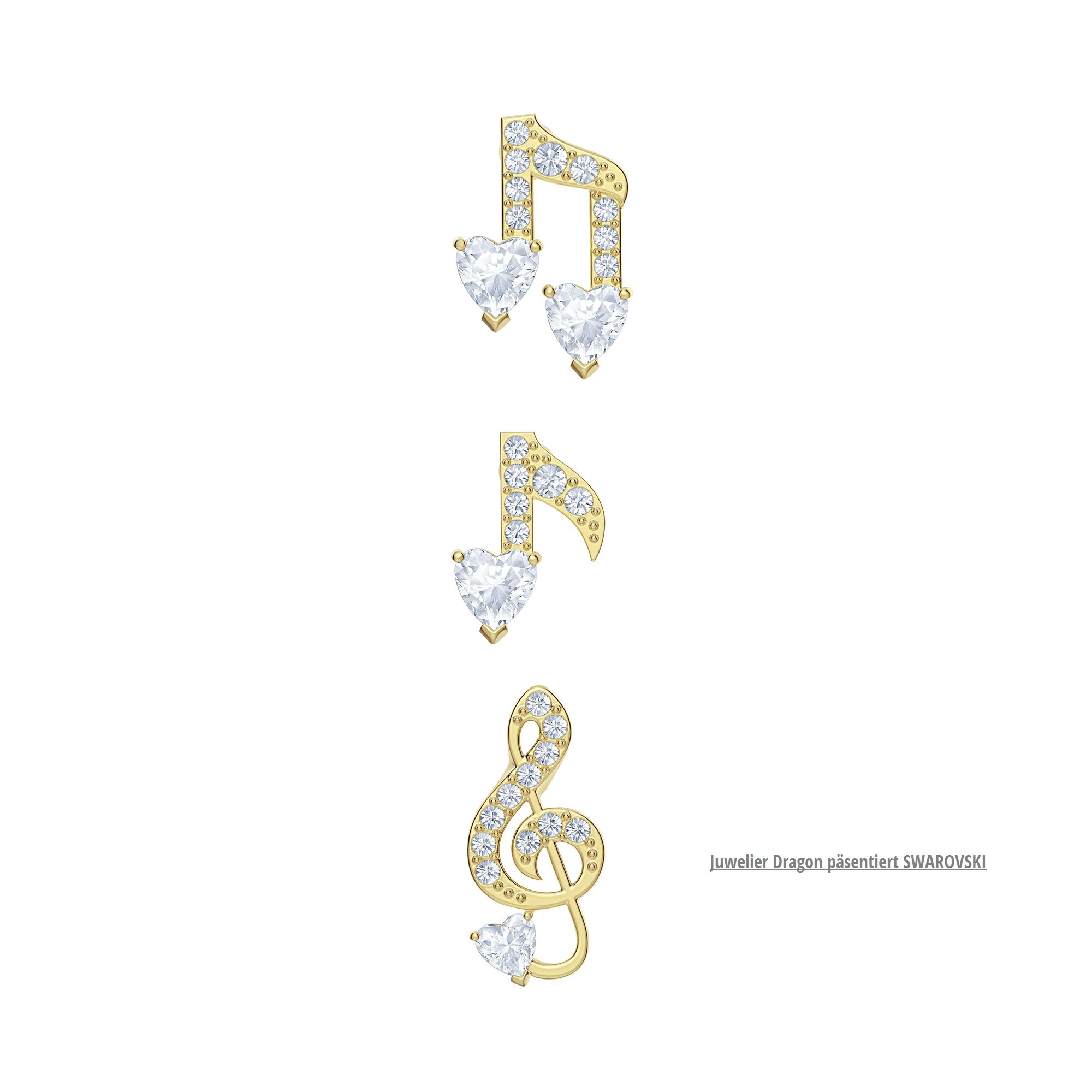 Mit diesem verspielten, von Musiknoten inspirierten Set aus drei individuellen Ohrsteckern komponieren Sie Ihr eigenes Styling. In jedem der drei vergoldeten Designs sorgt klares Kristall für ein maximales Funkeln. Mix & Match! Zusammen mit vielen anderen Styles entsteht ein cooler, asymmetrischer Look. Über diese originelle Geschenkidee freut sich jeder Musikfan.