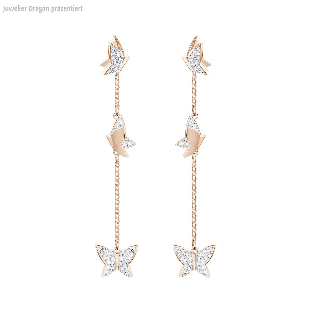 Mit diesen femininen, vielseitig tragbaren Ohrhängern mischen Sie die Mode in dieser Saison richtig auf. Das zeitlos schöne, rotgold glänzende Design überzeugt mit Schmetterlingen in funkelndem Kristallpavé. Entscheiden Sie sich für klassische Ohrstecker oder einen trendigen Look mit den langen, schwingenden Ketten. Wers richtig modemutig mag, trägt das unverkennbare Funkeln von Swarovski in einem zeitgenössisch asymmetrischen Look. Die dazu passenden Accessoires sind erhältlich.
